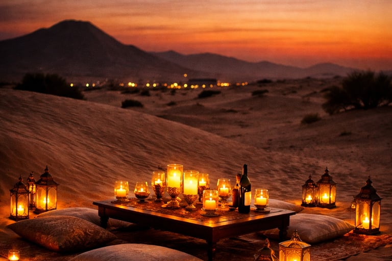 Imagine a candle-lit setup in the middle of the desert, surrounded by silence, stars, and complete privacy.